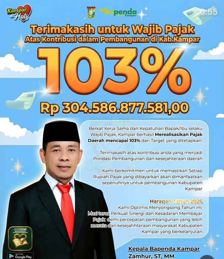 ” Mewakili Bapak Bupati Kampar Ahmad Yuzar, saya mengucapkan terima kepada seluruh wajib pajak yang telah membayar kewajibannya sehingga reaslisasi pendapatan pajak daerah Kabupaten Kampar tahun 2025 melampui target sebesar 103 persen,” terang Kepala Bapenda Kabupaten Kampar Zamhur kepada wartawan Rabu (7/1/26).