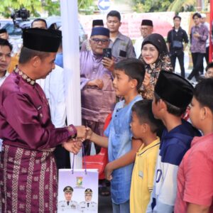 Terakhir sebelum berbuka puasa, Bupati Kampar Ahmad Yuzar, dan Wakil Bupati Kampar Hj. Misharti, memberikan santunan sembako untuk anak yatim dan fakir miskin. (Azman)